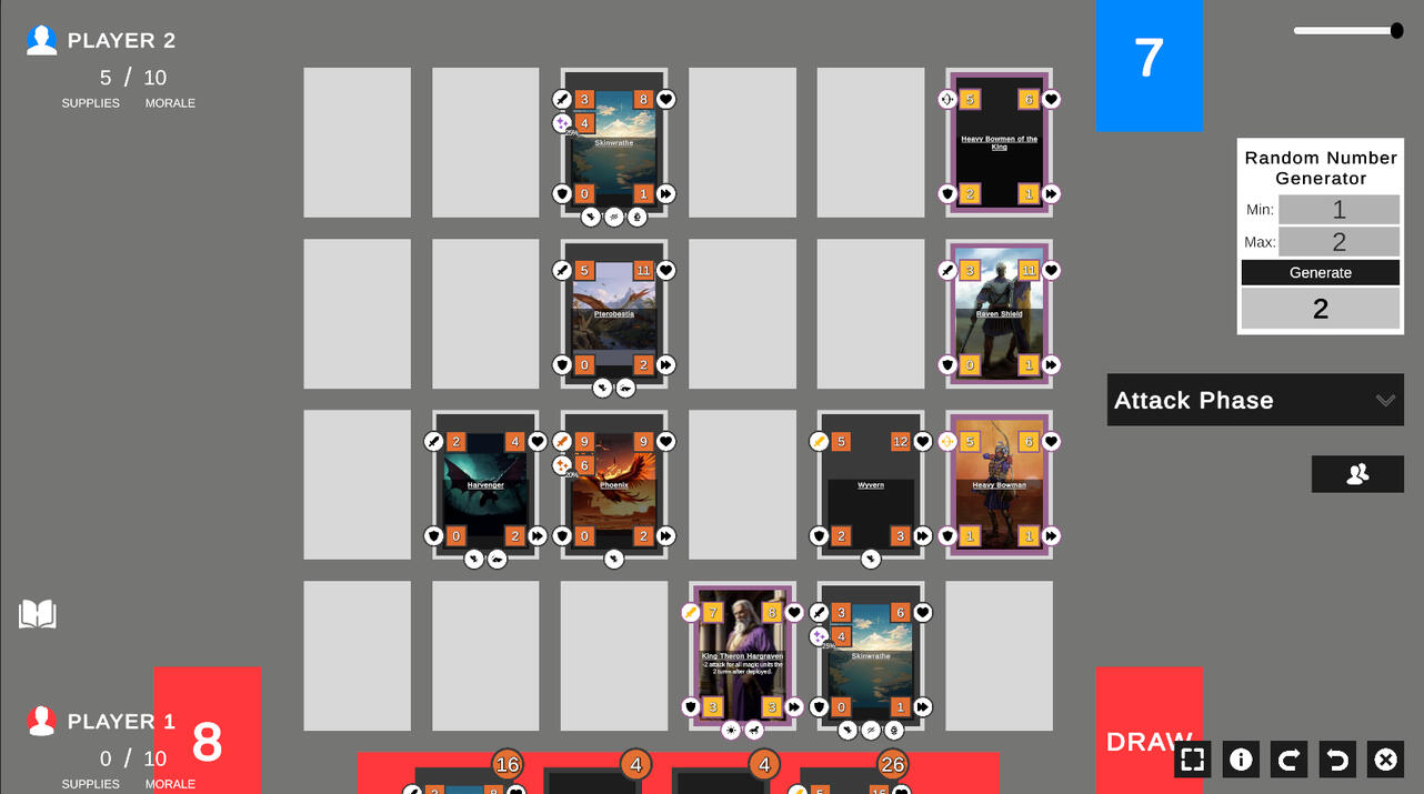 Build armies around card synergies, then face off across a battlefield where every choice carries weight.Battles unfold through three phases: Deploy - spend supplies to commit units and support cards, Movement - use speed to manoeuvre or invade enemy ground, and Attack - resolve combat based on remaining speed, where a fallen unit who was too slow, strikes no blow.